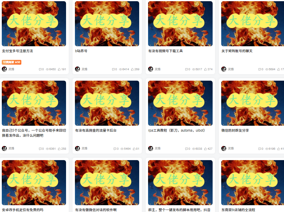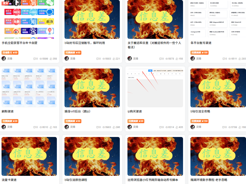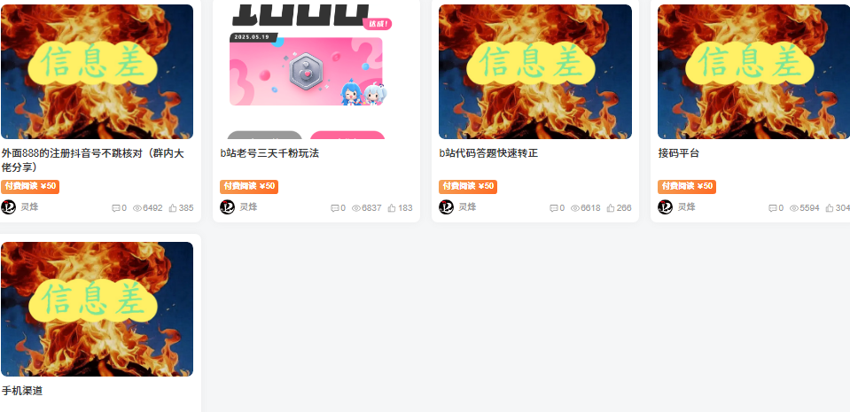我举一个最简单的例子,每年微信和抖音都会开口子,前段时间我给群友分享了一下抖音解封的一个口子,告诉大家有的自己去解,没有的拿去卖,有执行力强的群友卖了1000多。而且一个教程比我群费都贵。里面还有一些常用账号渠道等等。